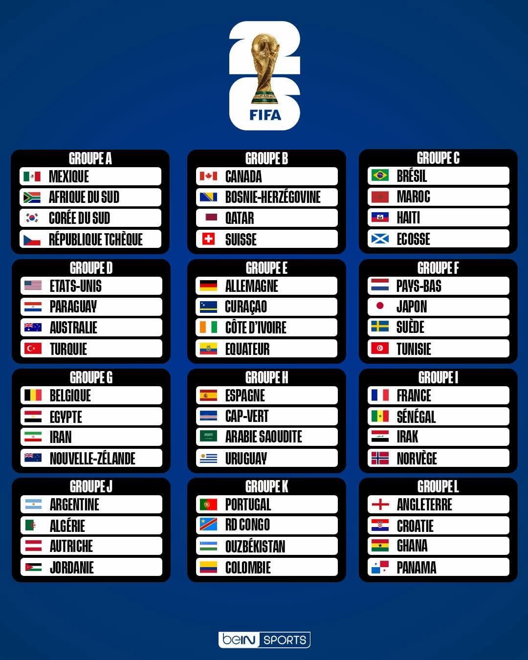 Group A: Mexico, South Africa, South Korea, and Czechia. Group B: Canada, Bosnia and Herzegovina, Qatar, Switzerland. Group C: Brazil, Morocco, Haiti, Scotland. Group D: United States, Paraguay, Australia, Türkiye. Group F: Netherlands, Japan, Sweden, Tunisia. Group I: France, Senegal, Iraq, Norway. Group K: Portugal, DR Congo, Uzbekistan, Colombia.
