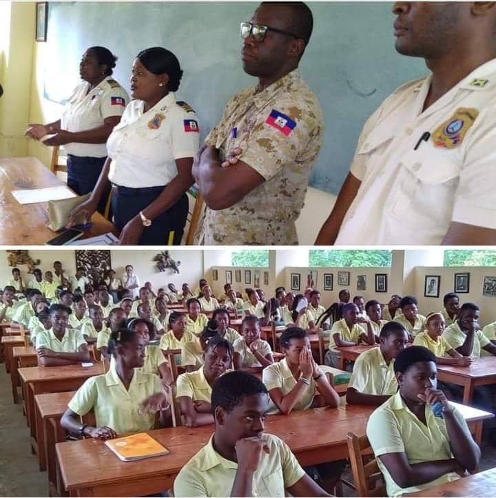 Sous la direction de la responsable du commissariat de Jacmel, l’inspectrice Marjorie Ladouceur, une délégation composée de responsables de plusieurs sections de la direction départementale du Sud-est, a rencontré le 23 mai dernier les élèves de plusieurs établissements scolaires de la place dont ceux du Lycée français et du Centre Culturel Alcibiade Pommayrac (CAP).